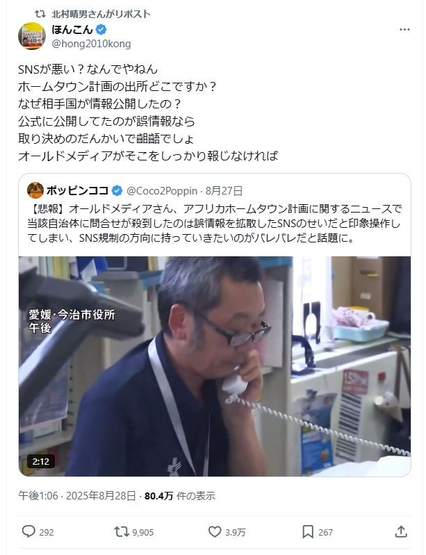 ほんこん「SNSが悪い?なんでやねん、ホームタウン計画の出所どこですか?オールドメディアがそこをしっかり報じろ」