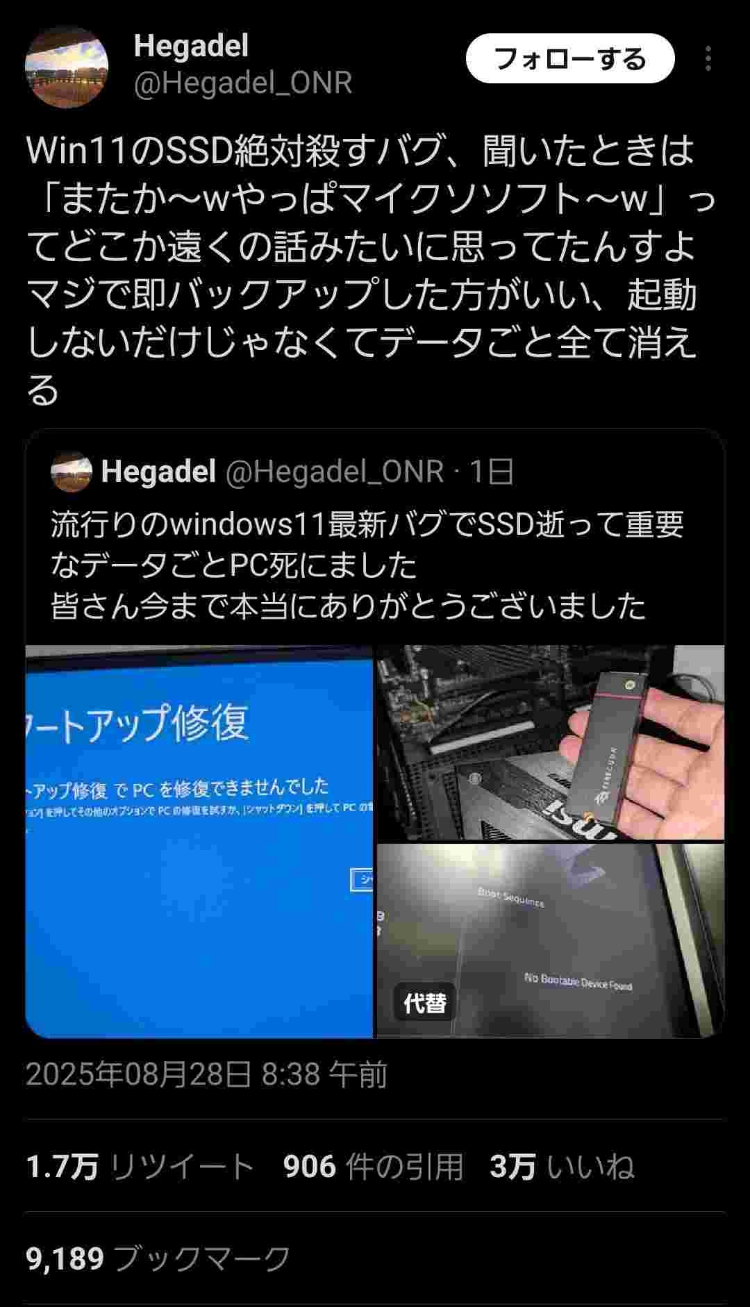 これ特定の会社のSSDだけが悪くてそれだけが被害を受けるってデマを流してる奴がいるらしいな