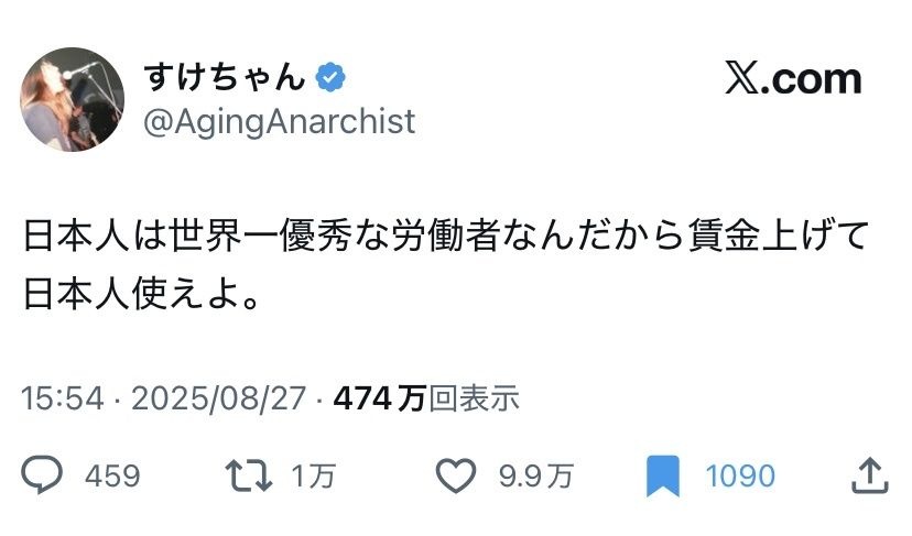 X民「日本人は世界一優秀な労働者なんだから賃金上げて日本人使えよ。」10万いいね