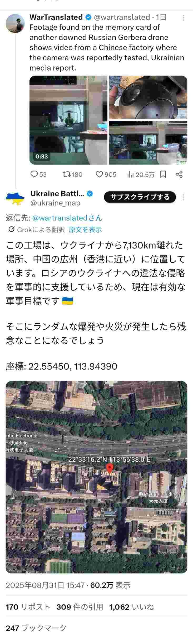 ウクライナメディア「ロシアのドローンから見つかった中国製部品を作っている深センの工場は有効な軍事目標です😤」