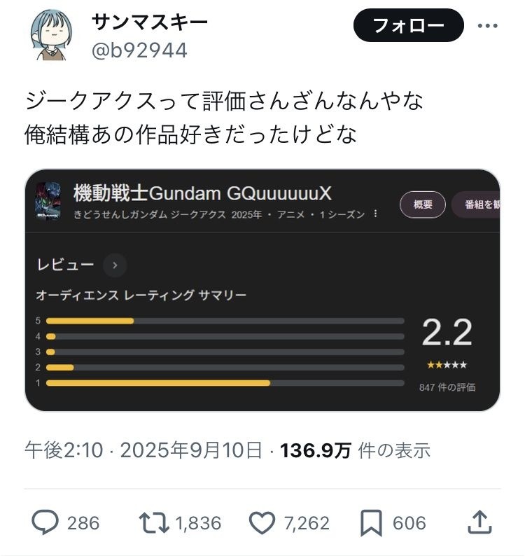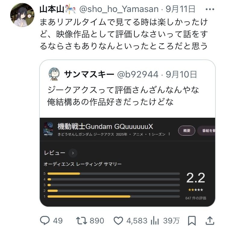 作品が楽しかったのではなくXでガンダム同窓会できたのがおじいちゃんたちには嬉しかったんだろう - 33 : 2025/09/13(土) 12:13:46.24 ID:RE6J5+oT0