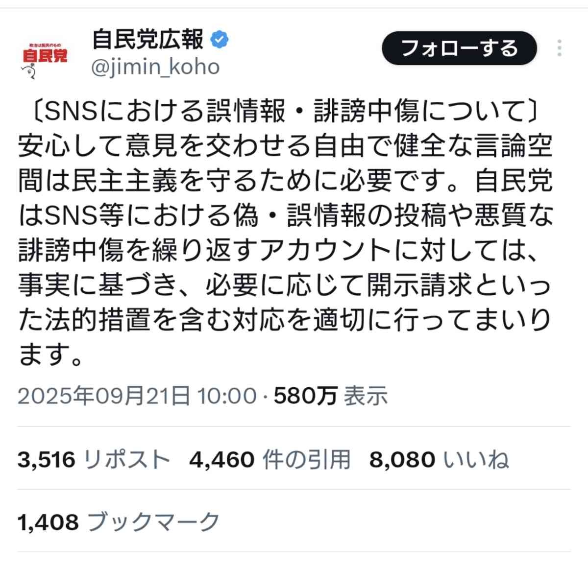 自民党、SNSでの誤情報の投稿や悪質な誹謗中傷に怒りの開示請求