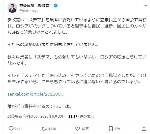 参政党神谷「ステマ委託やロシアがバックと選挙中に立憲、自民、維新、国民民からSNSで印象づけ、実際にやっていたのは自民党