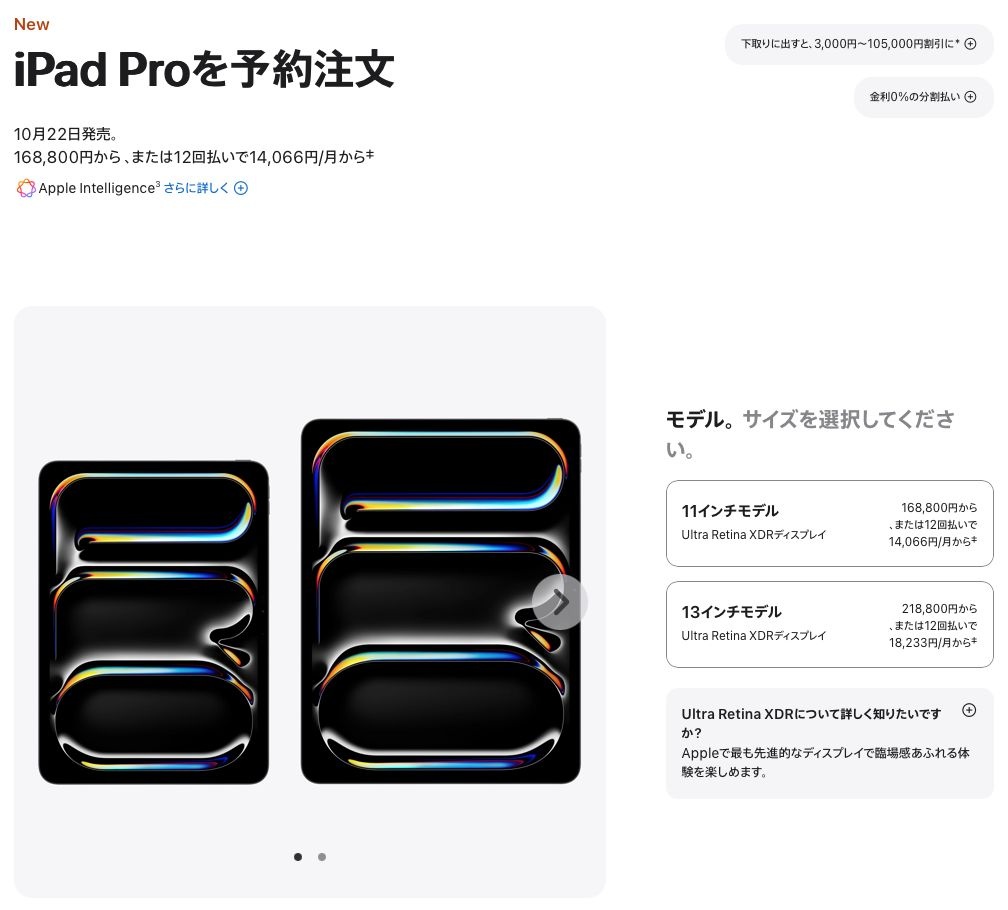 大きくディスプレイサイズが異なる、11インチモデルと13インチモデルで構成され、ストレージサイズは256GB、512GB、1TB、2TBのいずれかを選べる。また、Wi-Fi版とWi-Fi + Cellular版がラインアップされる。
