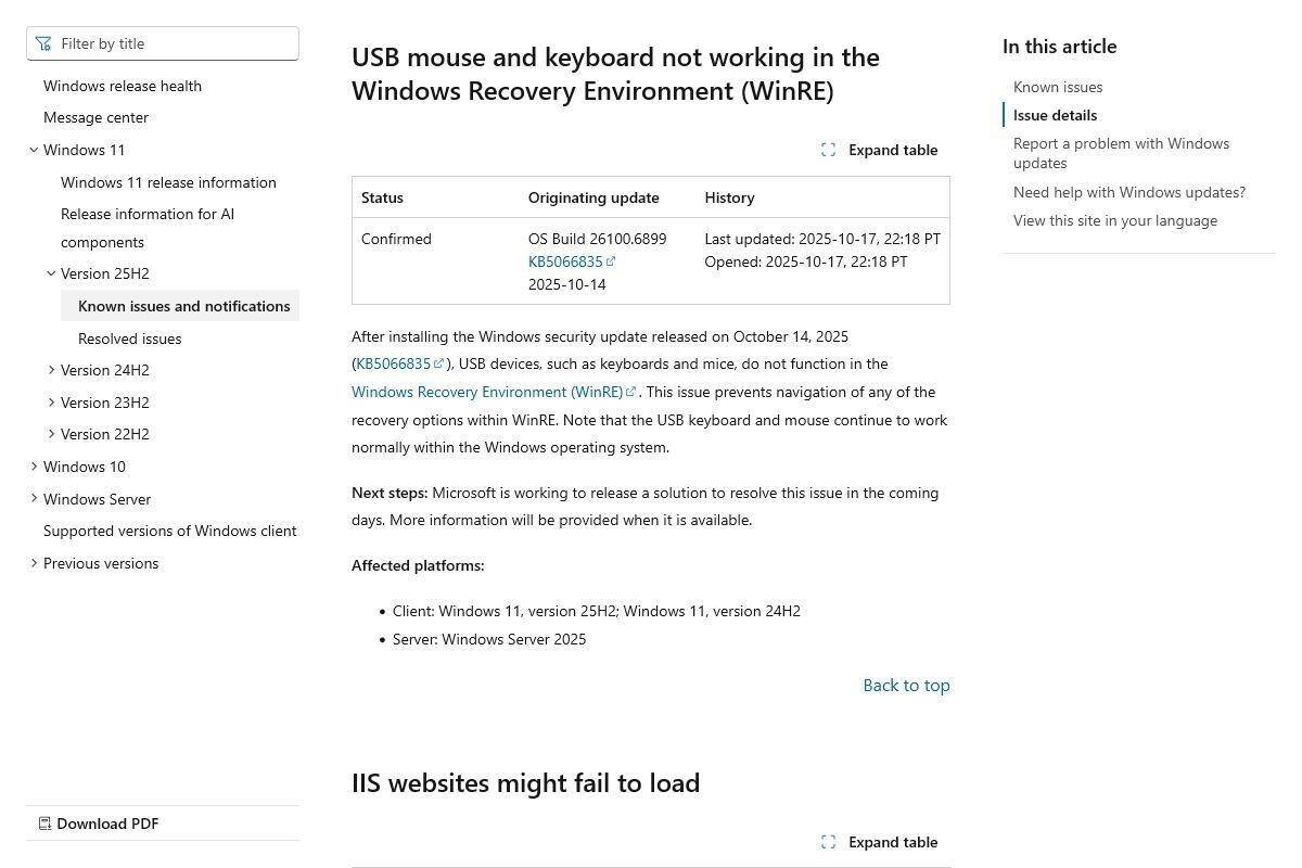 Windows 11、10月更新プログラムでキーボードとマウスが操作不能にMicrosoftは2025年10月17日(米国時間)、Windows 11向けの10月の月例更新プログラム「KB5066835」をインストールするとUSBマウスとキーボードが動作しなくなる可能性があると報じた。不具合はWindows回復環境(WinRE: Windows Recovery Environment)に影...news.mynavi.jpWindows 11、10月更新プログラムでキーボードとマウスが操作不能に