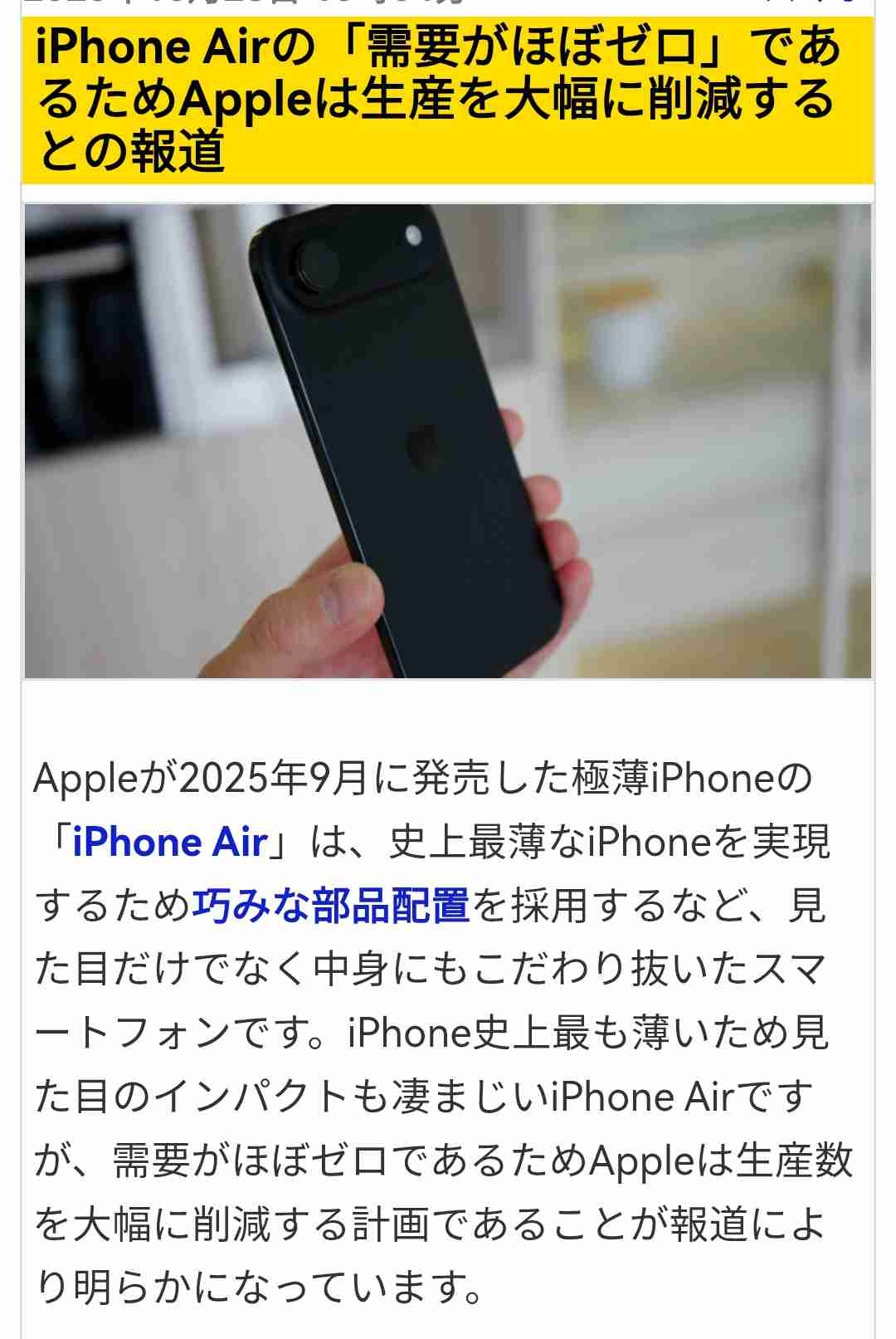 - iPhone Airの「需要がほぼゼロ」であるためAppleは生産を大幅に削減するとの報道