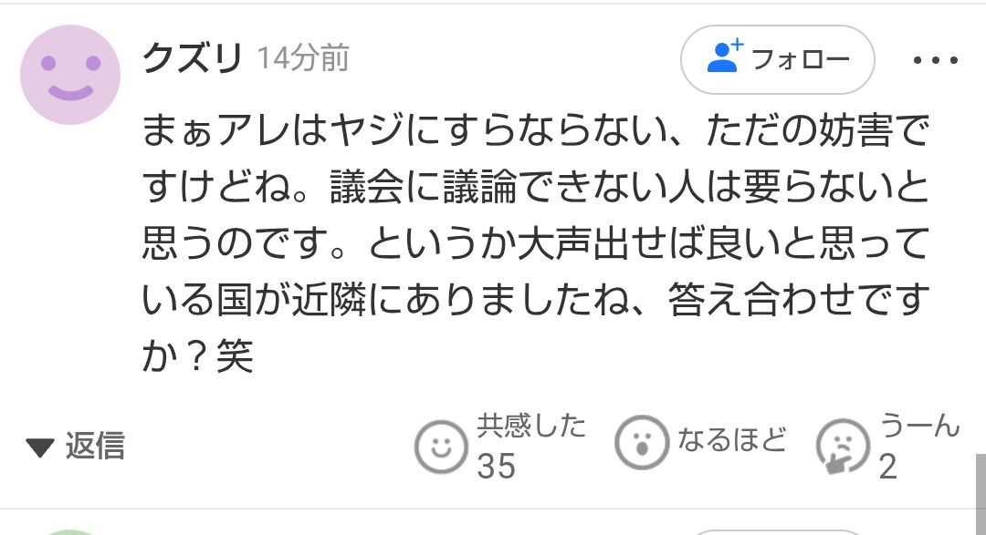 ヤフコメ「国会でヤジですらない妨害は要らない!大声出せばいいと思ってるのは近隣の国だけ(笑)」