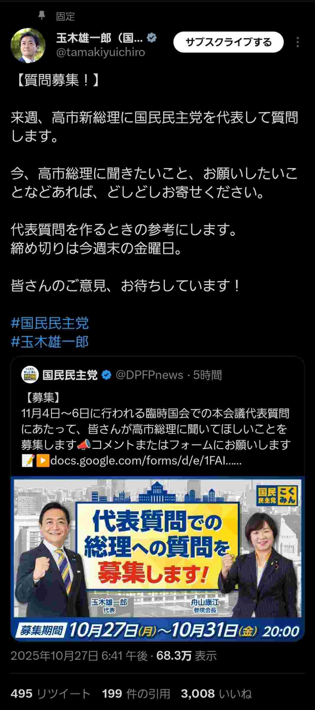 玉木「高市首相にする質問募集!」ツイッターで呼びかけ