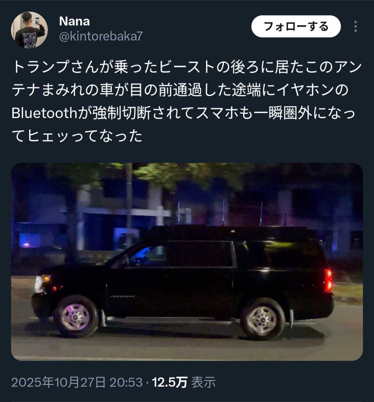 トランプ聖帝、ビースト以外にも電波妨害車も持ち込んでる模様。近くに寄るとスマホの電波もBluetoothもぶち切られる模様