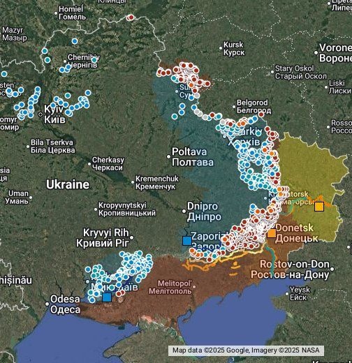 https://www.google.com/maps/d/viewer?mid=1V8NzjQkzMOhpuLhkktbiKgodOQ27X6IV≪=48.29393563380065%2C37.29835712618573&z=12ウクライナ側の報道でもドローンが飛び回ってるので