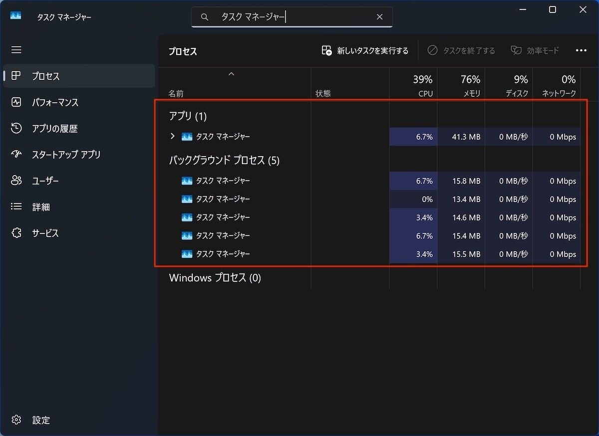 Windows Latestのレポートでは、このKB5067036を適用した一部のPCで、タスクマネージャーをウィンドウの「X」ボタンを押して閉じたとしても、正常にプロセスが終了できないことがあると伝えている。その状態で次にタスクマネージャーを立ち上げると、前のプロセスが残ったまま、重複して新しいタスクマネージャーのプロセスが起動してしまう。何度も繰り返すことで、バックグラウンドで多数のプロセスが終了できないまま残ってしまい、パフォーマンスに影響する可能性がある。筆者の環境でも再現