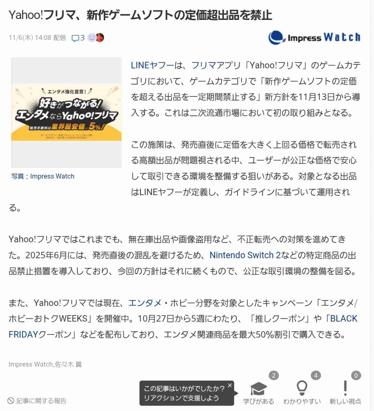 ヤフーフリマ、新作ゲームソフトの定価超出品を禁止へ