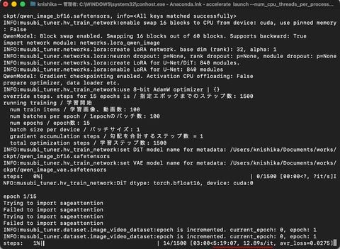 –fp8_base –fp8_scaled –blocks_to_swap 16あり。5時間19分