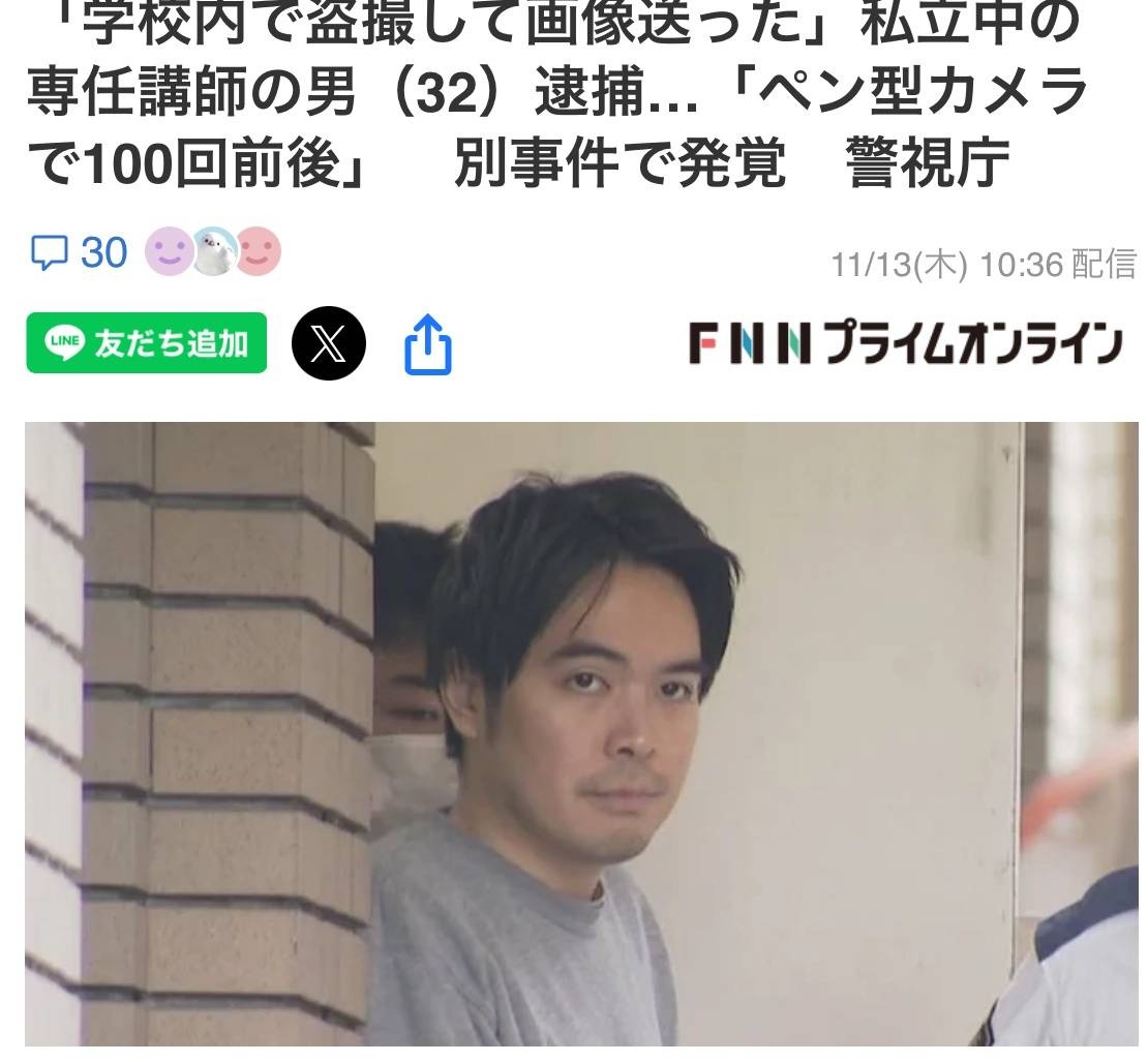下着姿の盗撮画像を送信疑い 私立中教員を逮捕「校内で撮影も」供述 | 毎日新聞他人の下着姿の盗撮画像を交流サイト(SNS)で送信したとして、警視庁葛飾署は12日、東京都内の私立中教員、佐藤淳人容疑者(32)=横浜市神奈川区=を、性的姿態撮影処罰法違反(提供)の疑いで逮捕したと発表した。mainichi.jp- 3 : 2025/11/13(木) 14:49:08.62 ID:9q7PPl3q0