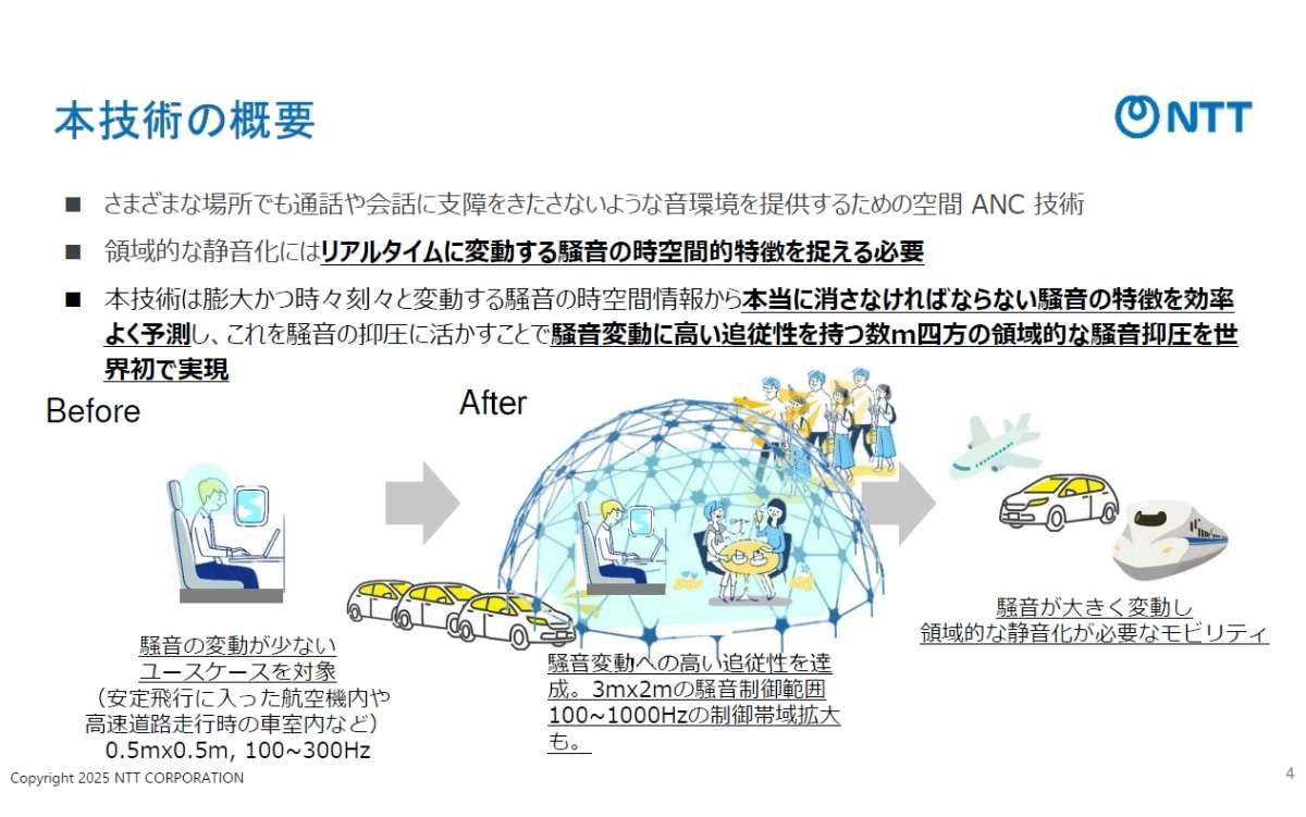- NTTは11月13日、空間全体の騒音をリアルタイムで制御する「空間ノイズキャンセリング技術」を発表した。耳栓やイヤホンなどを使わずとも、複数の騒音源が混在する環境で快適に会話や作業を継続できる音空間を実現するもので、今後はモビリティ、オフィス、住環境などでの活用を視野に入れる。