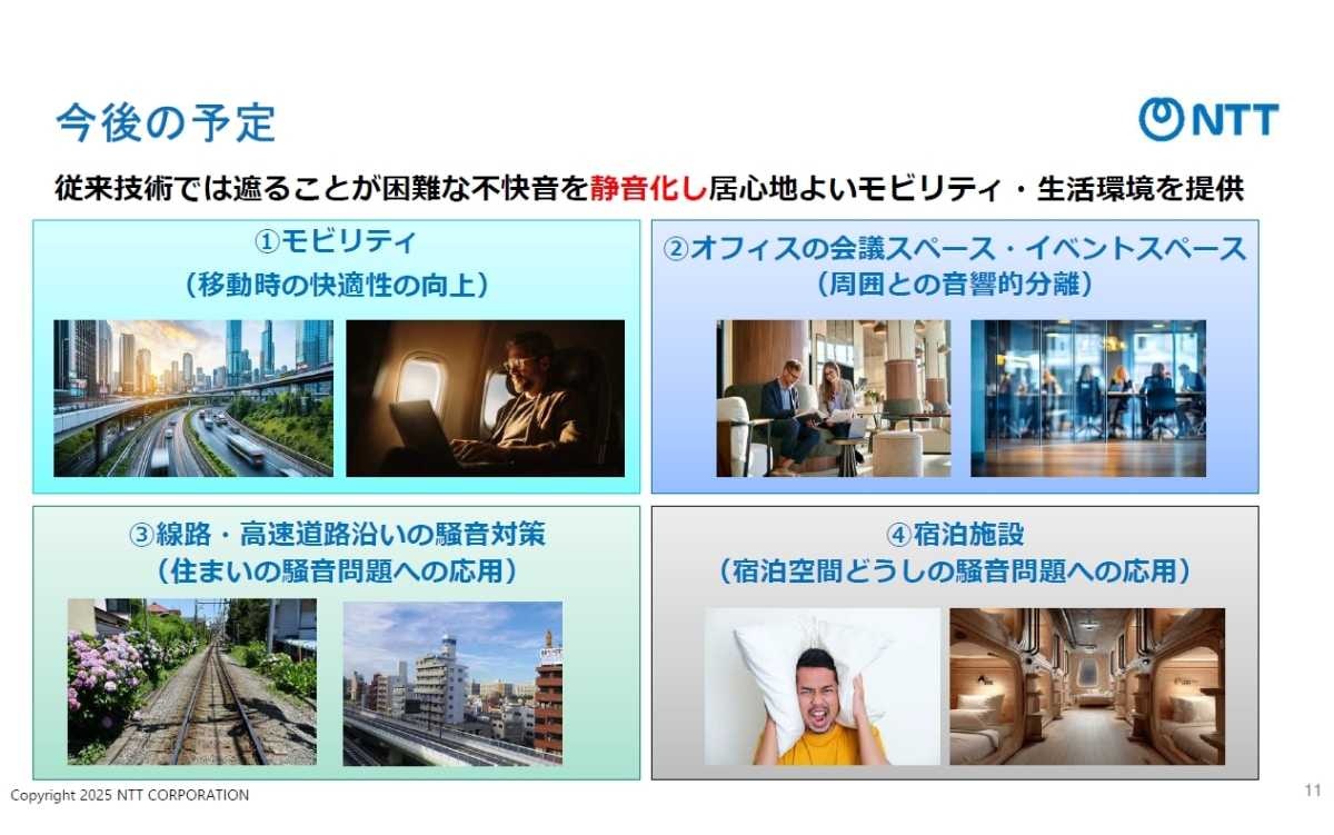 今後の利用例としては、モビリティのほか、オフィスの会議室やイベントスペース、線路・高速道路沿いの騒音対策、宿泊施設などを想定。例えば会議室で周囲の雑音を抑えて、内部の会話が聞き取りやすい空間を作る、あるいは住宅において壁面に本技術を導入し、近隣からの騒音を抑制するといった応用が期待される。ホテルなどの宿泊施設でも、隣室からの音漏れを防ぐための手段としての導入も検討されている。