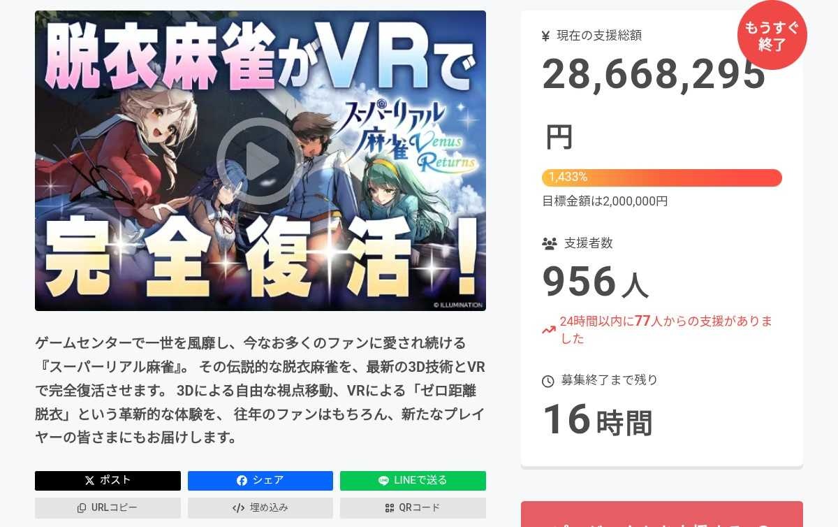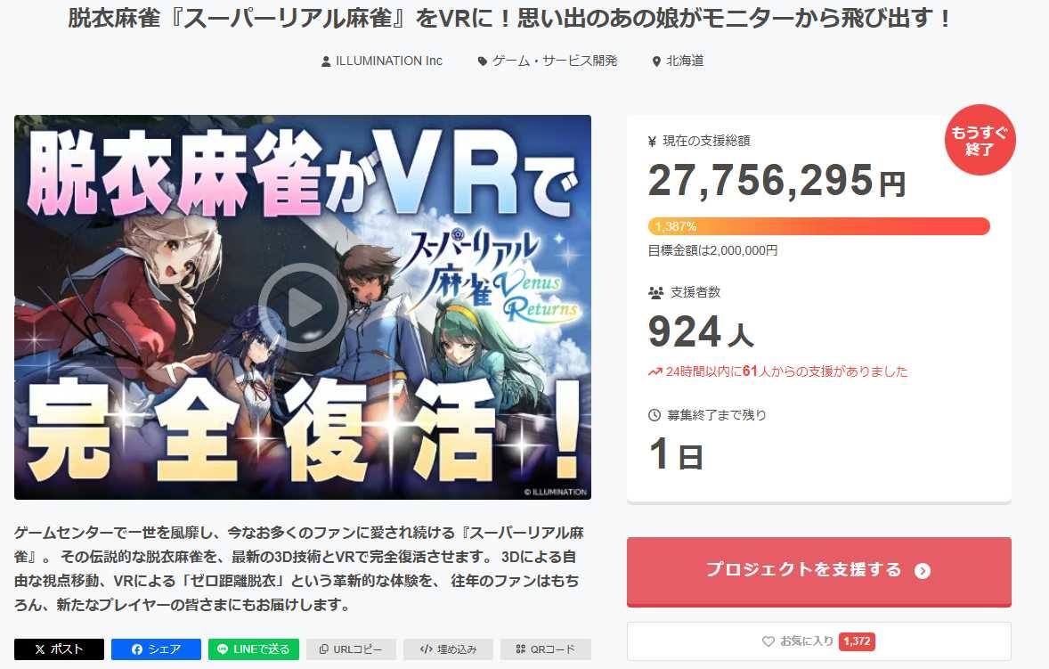 『スーパーリアル麻雀』VRのクラファンが目標の14倍集まる