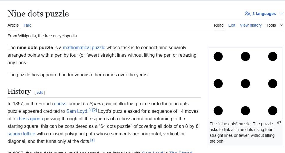 日本語wikipediaは「ナインドットパズル」の記事さえない。欧米との知能格差ヤバい。