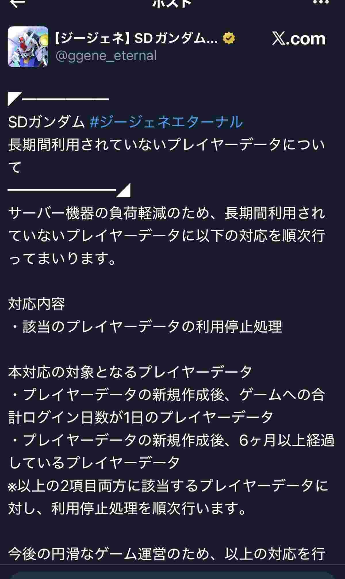 ジージェネ」6ヵ月起動無しのプレイヤーデータを停止