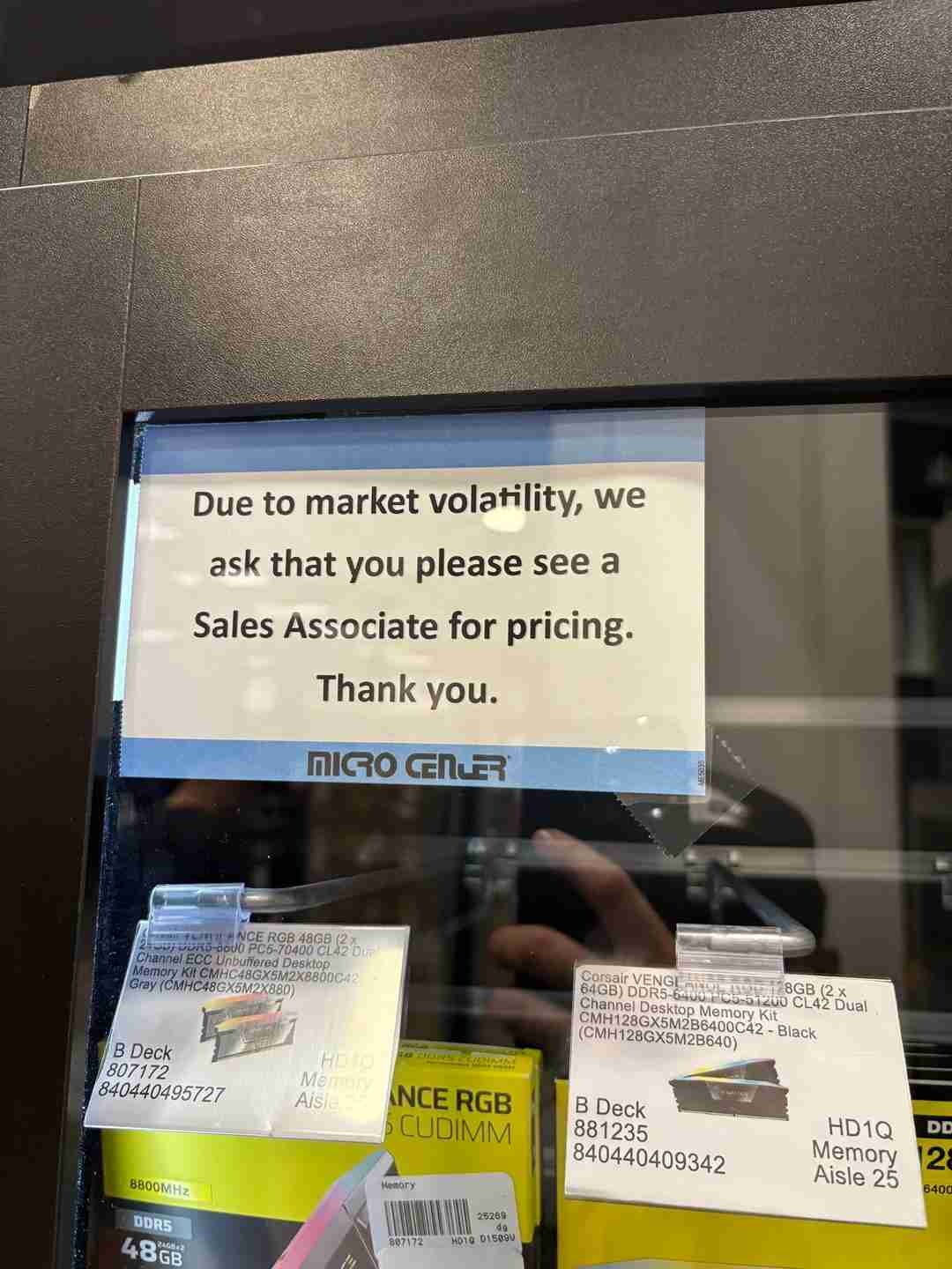 Redditユーザーが投稿した画像によると、Micro Centerのメモリー売り場には「市場の変動により、価格については販売員にお問い合わせください」と記載された大きなステッカーが貼られていました。陳列されているメモリーには価格タグが一切付けられておらず、事実上の時価販売となっています。