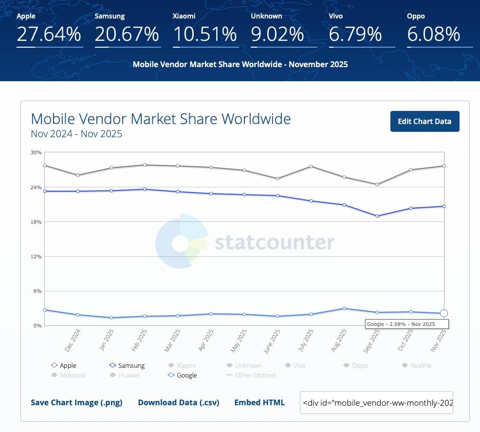 https://gs.statcounter.com/vendor-market-share/mobile/worldwide