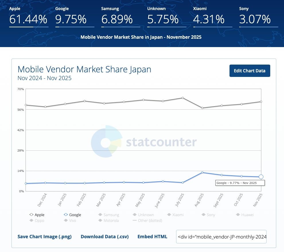 日本のデータで面白いのはiPhoneが下がったタイミングでPixelが上がって