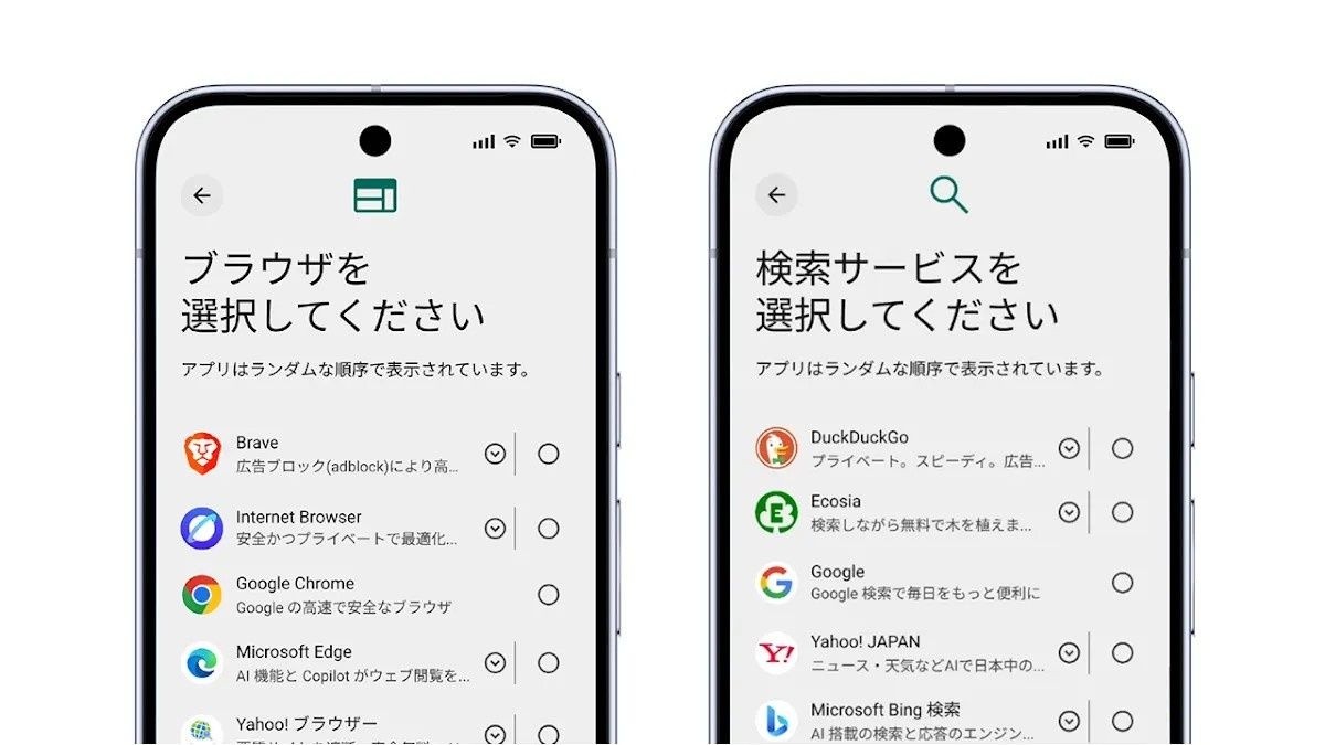 - 2025 年 12 月以降、Android (Android 15 以上の端末) でシステム アップデートやソフトウェア アップデートをすると、デフォルトのブラウザや検索サービスを選択する画面が順次、表示されます。