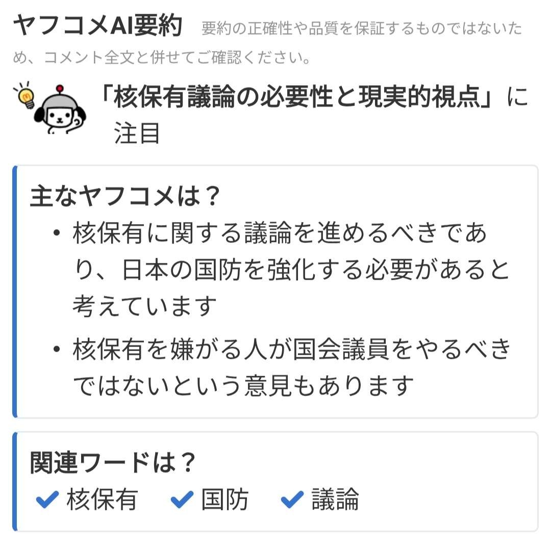 官邸関係者「核を持つべきだ」発言 中谷前防衛大臣が責任論に言及「軽々に話すべきではない」(ABEMA TIMES) - Yahoo!ニュース高市政権で安全保障政策を担当する官邸関係者が、オフレコを前提にした記者団による非公式取材の場で、個人的な見解としたうえで「私は核を持つべきだと思っている」と述べ、日本の核兵器保有が必要だとの考えをnews.yahoo.co.jp- 2 : 2025/12/19(金) 17:32:56.54 ID:b41/oiIo0