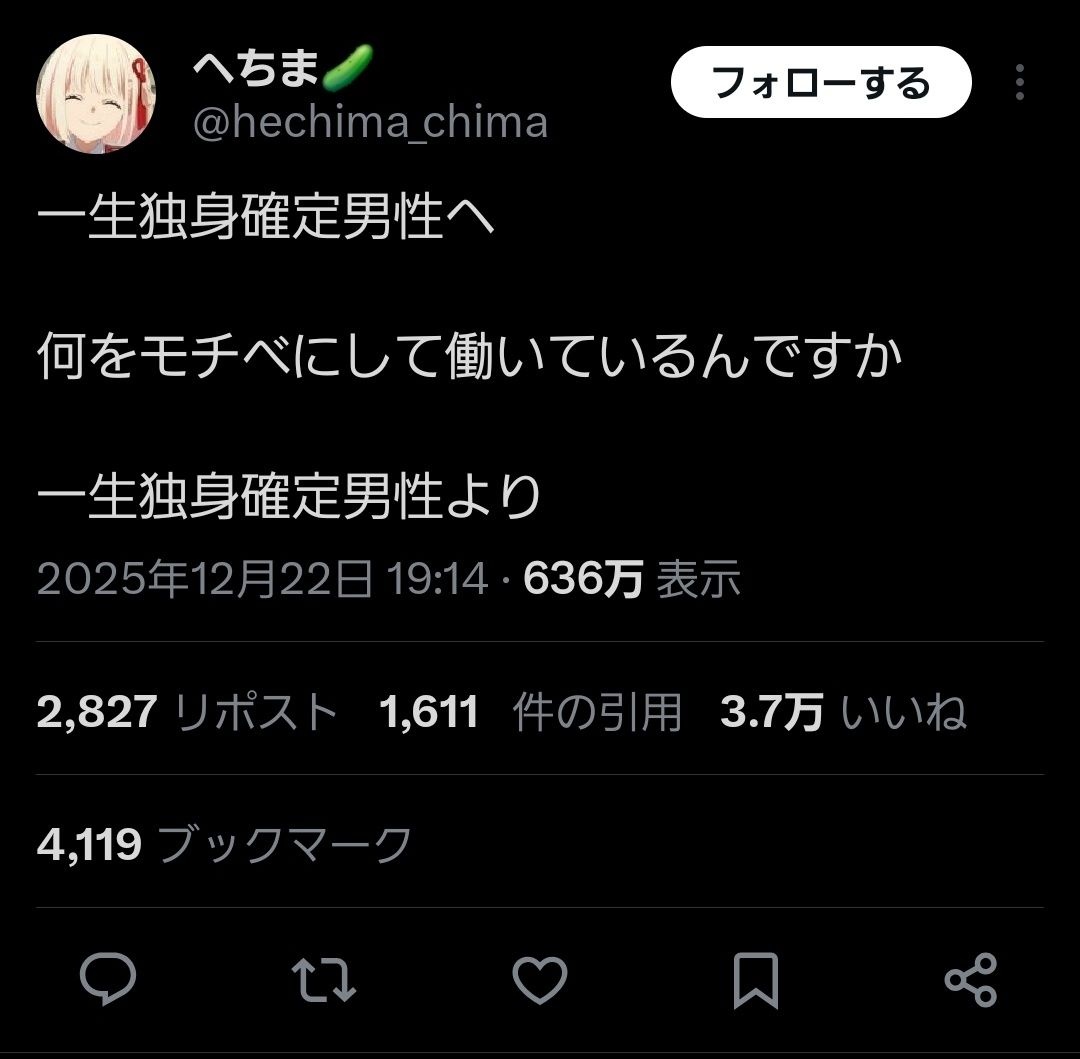 結婚しなくてもセクロスして子孫を残せるようになったら、結婚する人はずいぶんと減るだろうね - 26 : 2025/12/24(水) 09:38:54.45 ID:Iv285/LfdEVE