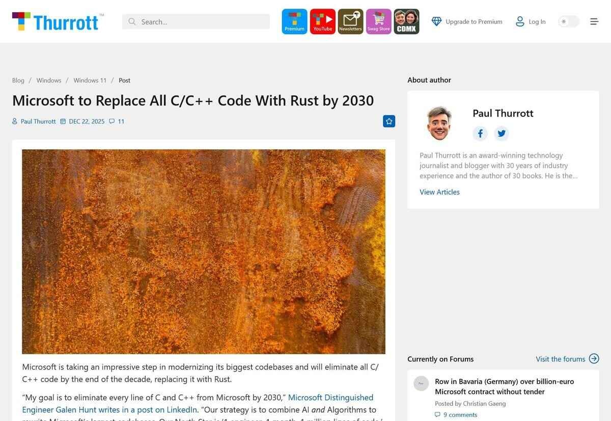 - 技術ジャーナリストのPaul Thurrott氏は12月22日(現地時間)、「Microsoft to Replace All C/C++ Code With Rust by 2030 – Thurrott.com」において、Microsoftが2030年までに自社の主要コードベースからCおよびC++を全面的に排除し、Rustへ移行する長期方針を明らかにしたと報じた。