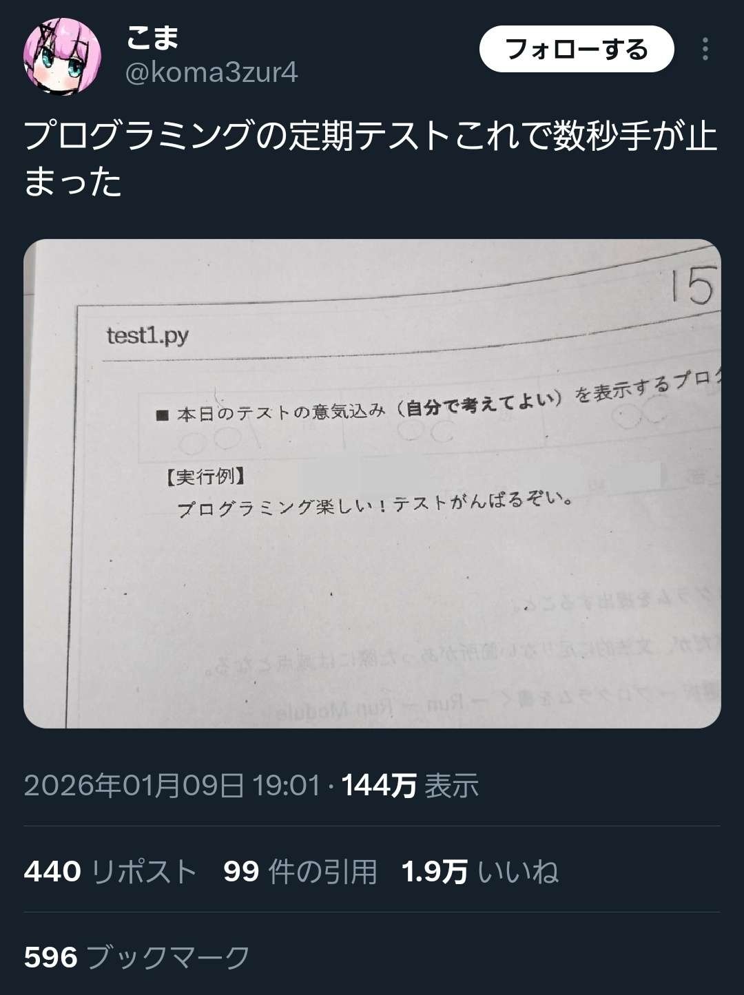 print(“プログラミング楽しい!テストがんばるぞぃ。”) - 16 : 2026/01/10(土) 15:28:13.94 ID:y3Poptcs0
