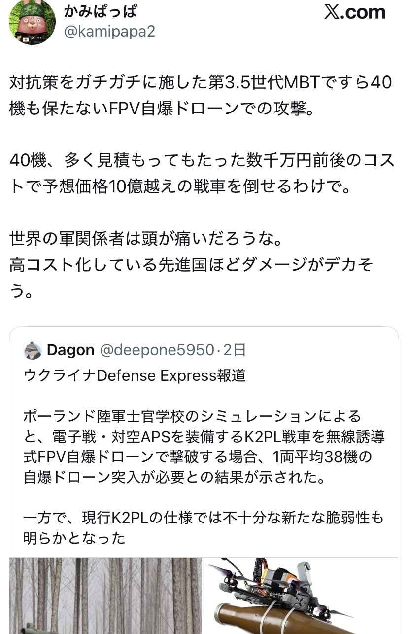 愛国者「ドローン40機で破壊される戦車はコスパ悪すぎ。戦車は不要!」👈コイツ