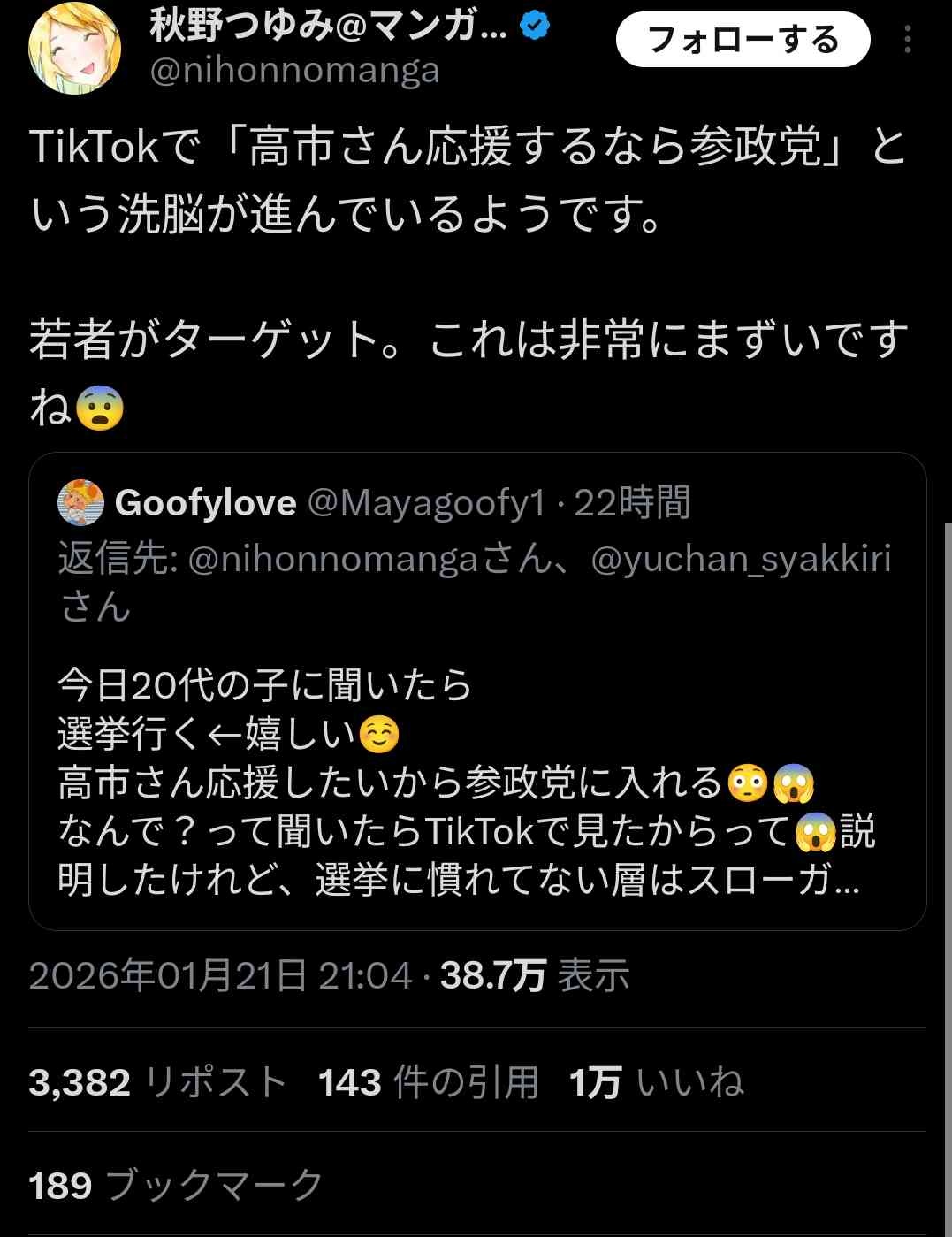 「高市さんを応援するなら参政党」とかいうトンデモ情報、TikTokで大拡散されてしまうwww