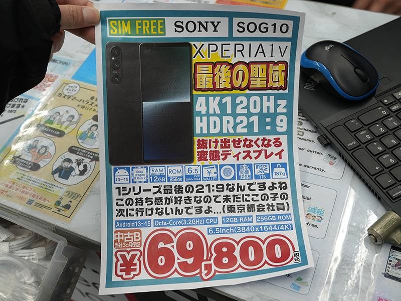 【秋葉】ソニー「Xperia1 V」の中古、ほとんど傷がない状態で69800。スナドラ8G2 4K120Hz21:9 12G 256G 全部のせモデル 急げ