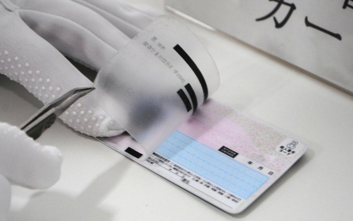 警視庁が押収した偽造マイナカード。本物の上から別人の情報を印字したフィルムを貼り付けていた(15日、東京都千代田区
