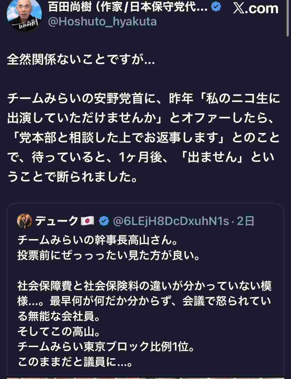 百田尚樹「チームみらいの安野貴博にニコ生に出てくれと言ったら断られた!」