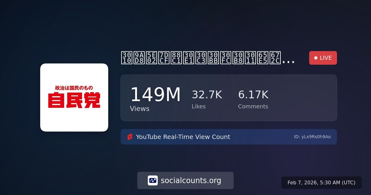 149,659,514【高市総裁メッセージ】日本列島を、強く豊かに。 | Real-Time YouTube Live View Count | SocialCounts.orgTrack the real-time view count of 【高市総裁メッセージ】日本列島を、強く豊かに。 on YouTube with SocialCounts.org. Stay updated on the view growth and popularity of this renowned vide...socialcounts.org - 2 : 2026/02/07(土) 15:11:35.504 ID:LJL6eSquU