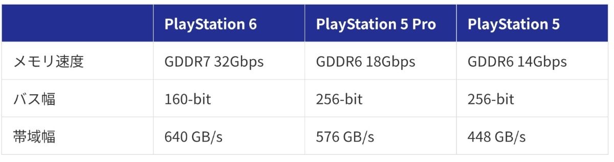 PS6の640GB/sという帯域幅は、現行の通常版PS5に対して約43%増と大幅に向上している一方、PS5 Proとの比較では約11%増にとどまっており、バス幅の縮小もあって帯域幅の伸びは限定的です。ただし、PS6ではRDNA 5アーキテクチャの採用によりメモリ圧縮性能が向上するほか、AIやレイトレーシング専用ブロックの強化によってGPUとメモリ間のデータ転送量が削減されるため、大幅な帯域幅増がなくともグラフィックス性能の向上が見込まれています。