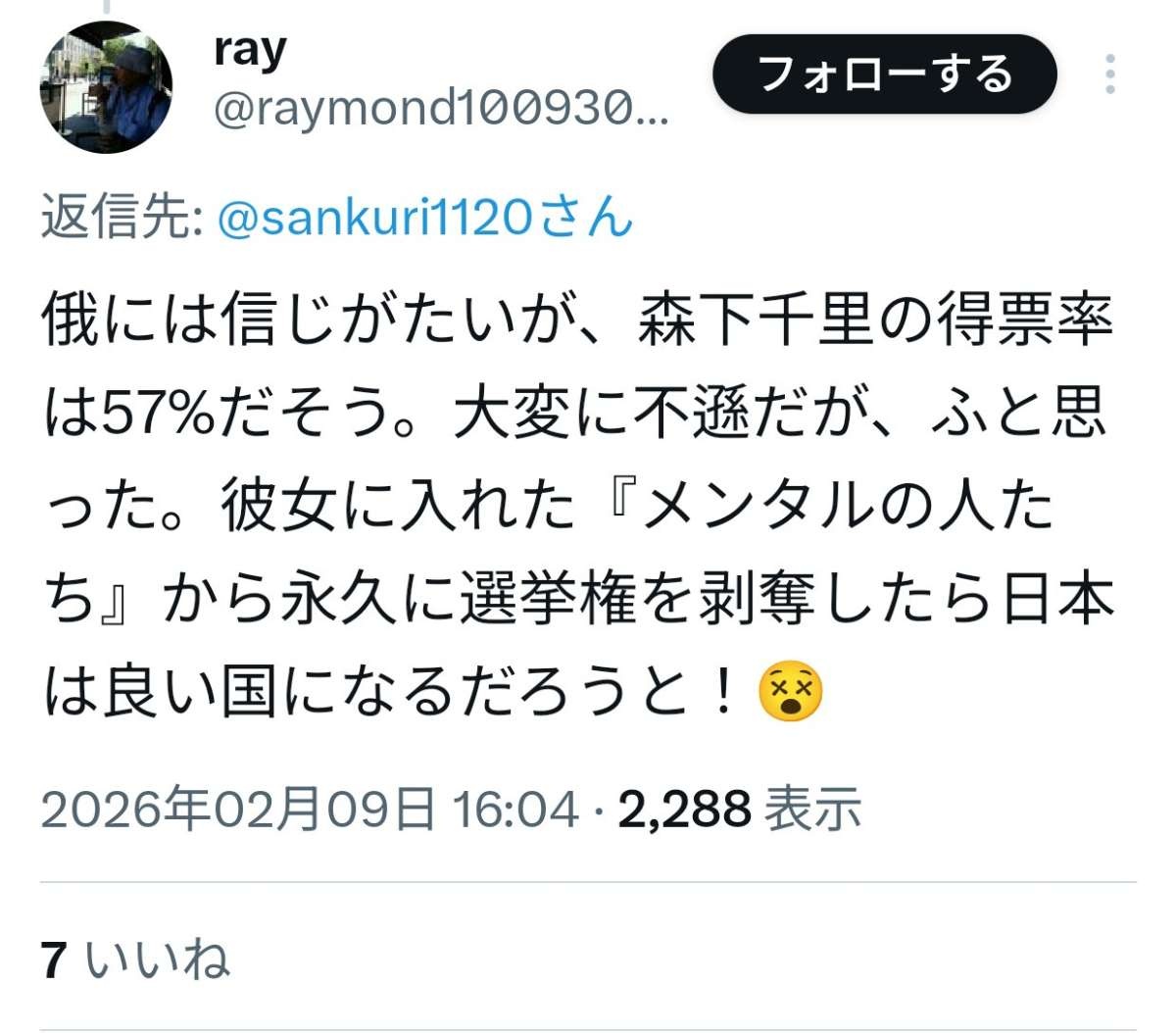自称中道保守X民「森下千里に投票した連中の投票権を永久に剥奪しろ!!!」