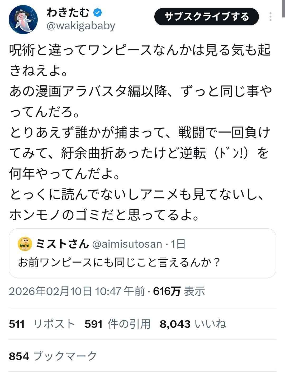X民「ワンピースは死滅回游よりつまらん、ずっとやってる事ワンパターンだしw」←8000いいね