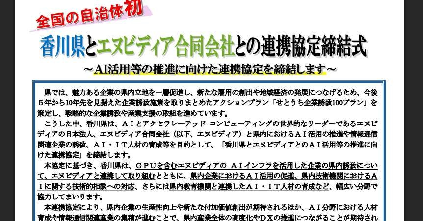 香川県がエヌビディアと連携協定 全国の自治体で初(ITmedia NEWS)