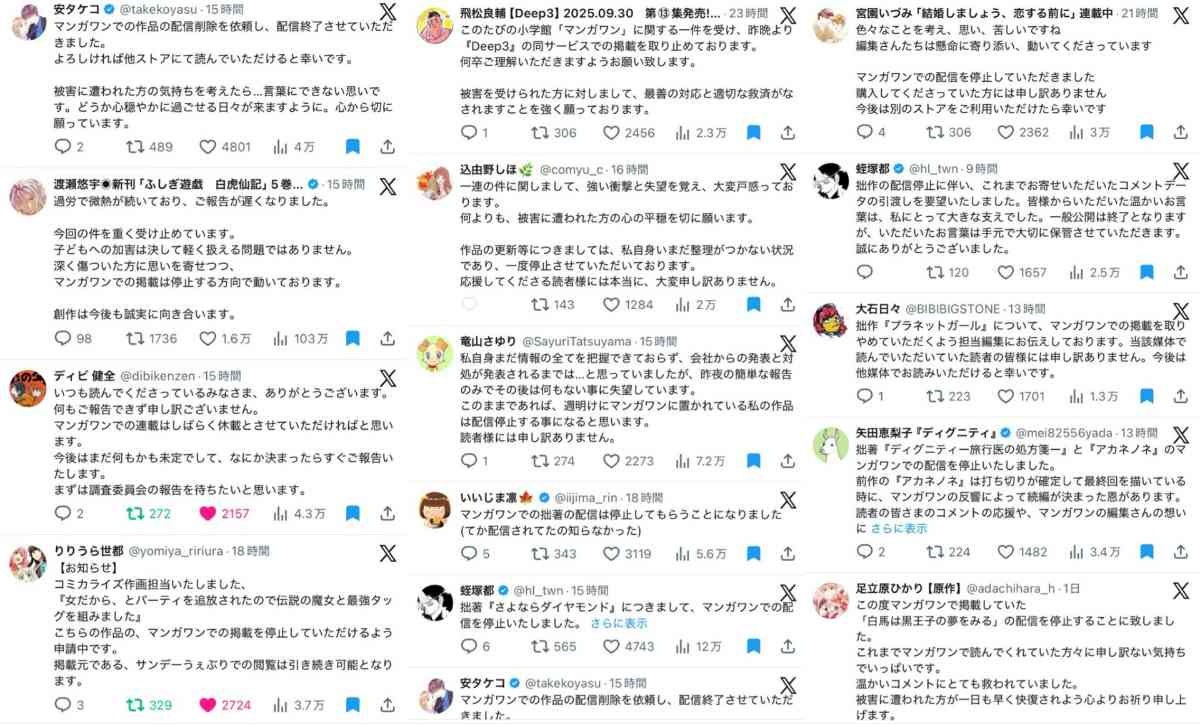 マンガワン配信停止を告知した漫画家、多すぎる