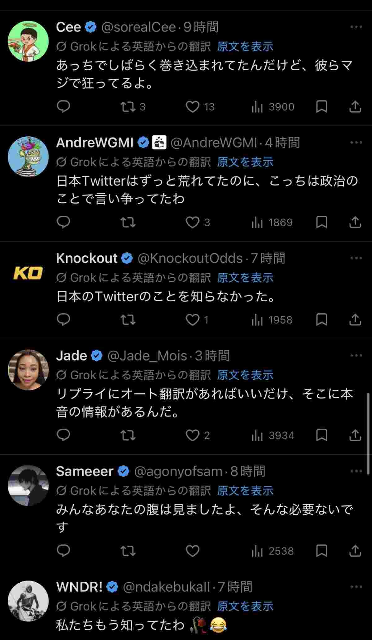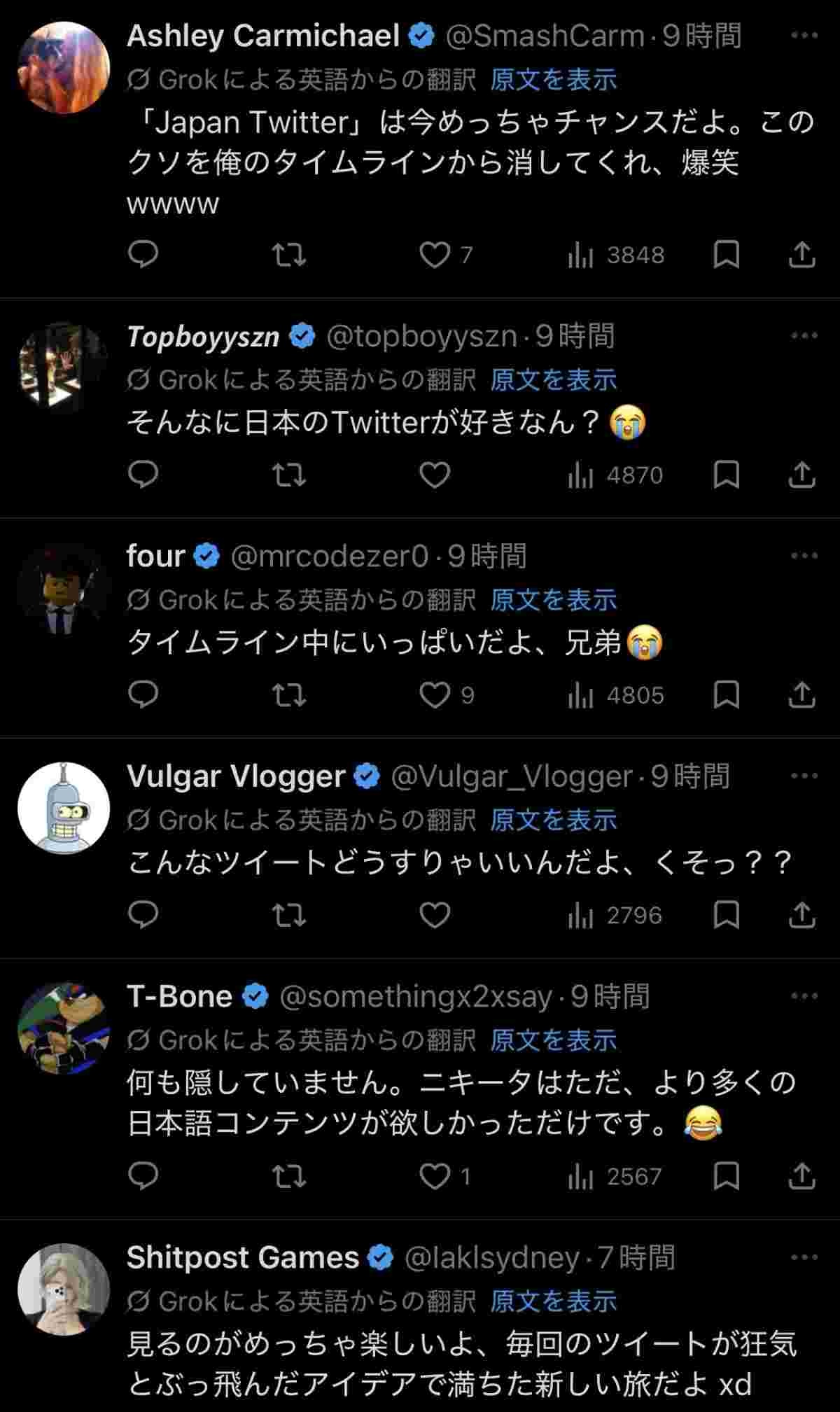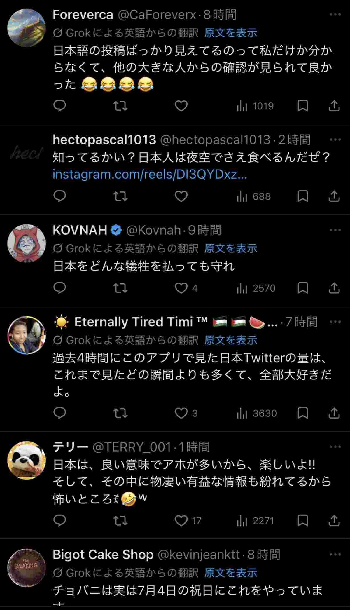 何か最近、イーロンマスクが日本語のツイートを勝手に英語圏の連中に自動で英語に翻訳する機能みたいなのを提供して、日本人のクソみたいなポストが全世界に反映されちゃうようになった - 57 : 2026/03/30(月) 22:50:00.60 ID:VOOfGWig0