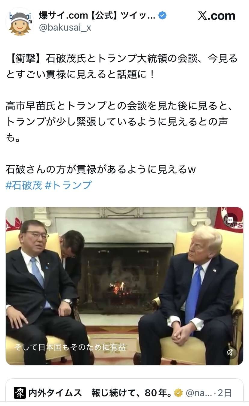 爆サイ「え、石破ってこんなに貫禄あったんだ。トランプが緊張してる」ネトウヨ「!?」