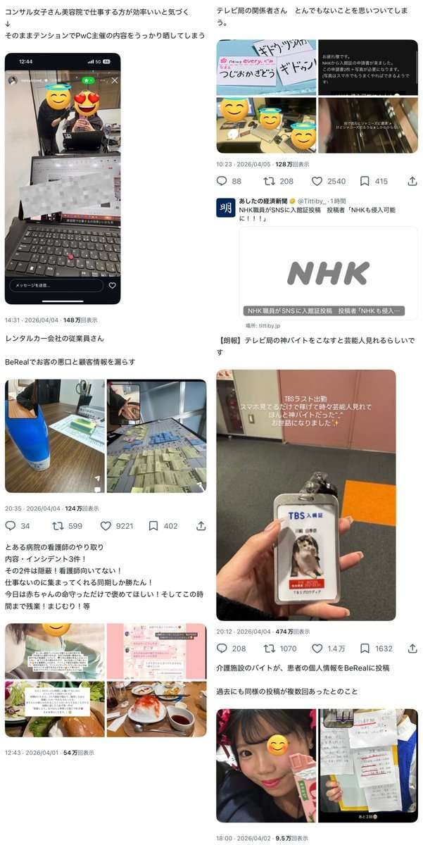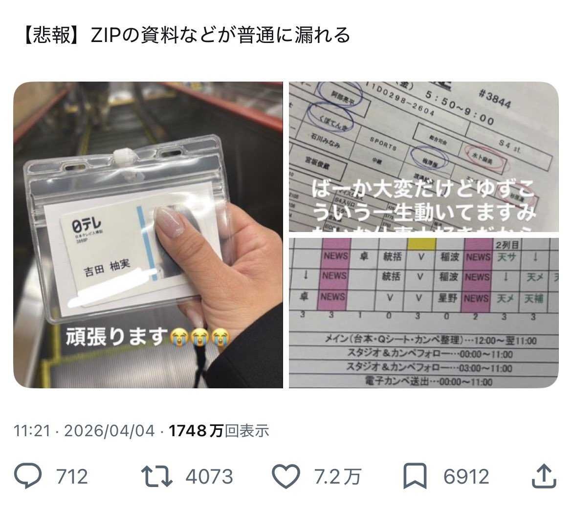 テレビ業界では、映像制作会社の新入社員とされる人物が、日本テレビの入館証や制作現場のシフト表をSNSに投稿。シフト表には『ZIP!』(日本テレビ系)のロゴが入っており、大きな波紋を呼んでいる。