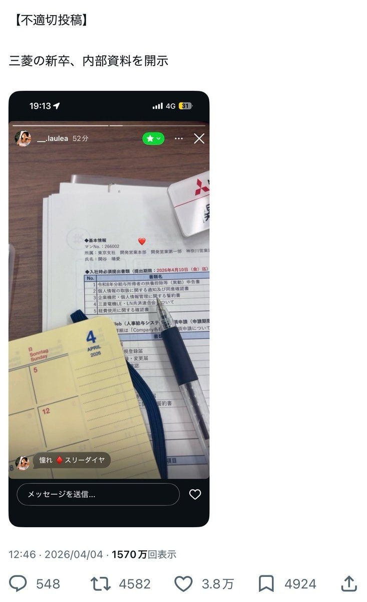 「ほかにも、三菱電機子会社の新入社員が、入社手続きに関わる資料を漏洩。資料には社員番号や所属部署、本人のフルネーム、さらには機密保持誓約書も含まれていました。どこからどう考えても“社外秘”の資料だと思うのですが、いったいどうしてSNSに載せてOKだと思ったのか……」(大手企業の人事担当者)
