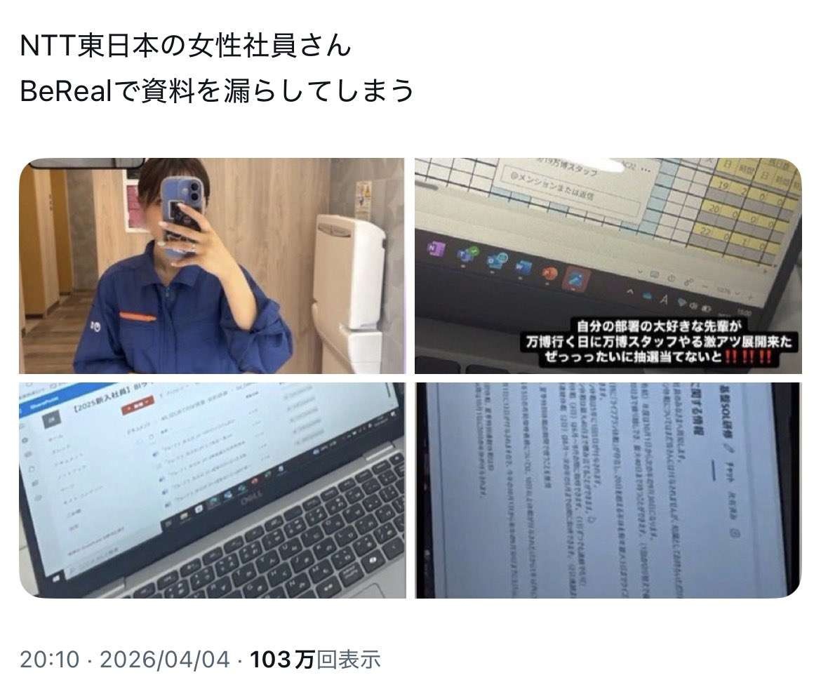 また、NTT東日本では、女性社員と見られる人物がシフト表などを写真共有アプリ『Be Real』に掲載。こちらは2025年新卒の人物の投稿が掘り起こされたと思われる形だが、配置組織についての文書や新入社員向けの内部資料もアップされている。