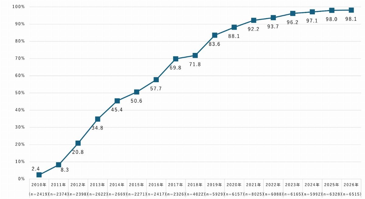 まず、携帯電話を保有している人に占めるスマートフォン比率の推移を見ると、2026年は98.3%となった。2010年の2.4%から大きく伸び、近年はほぼ横ばいで推移している。