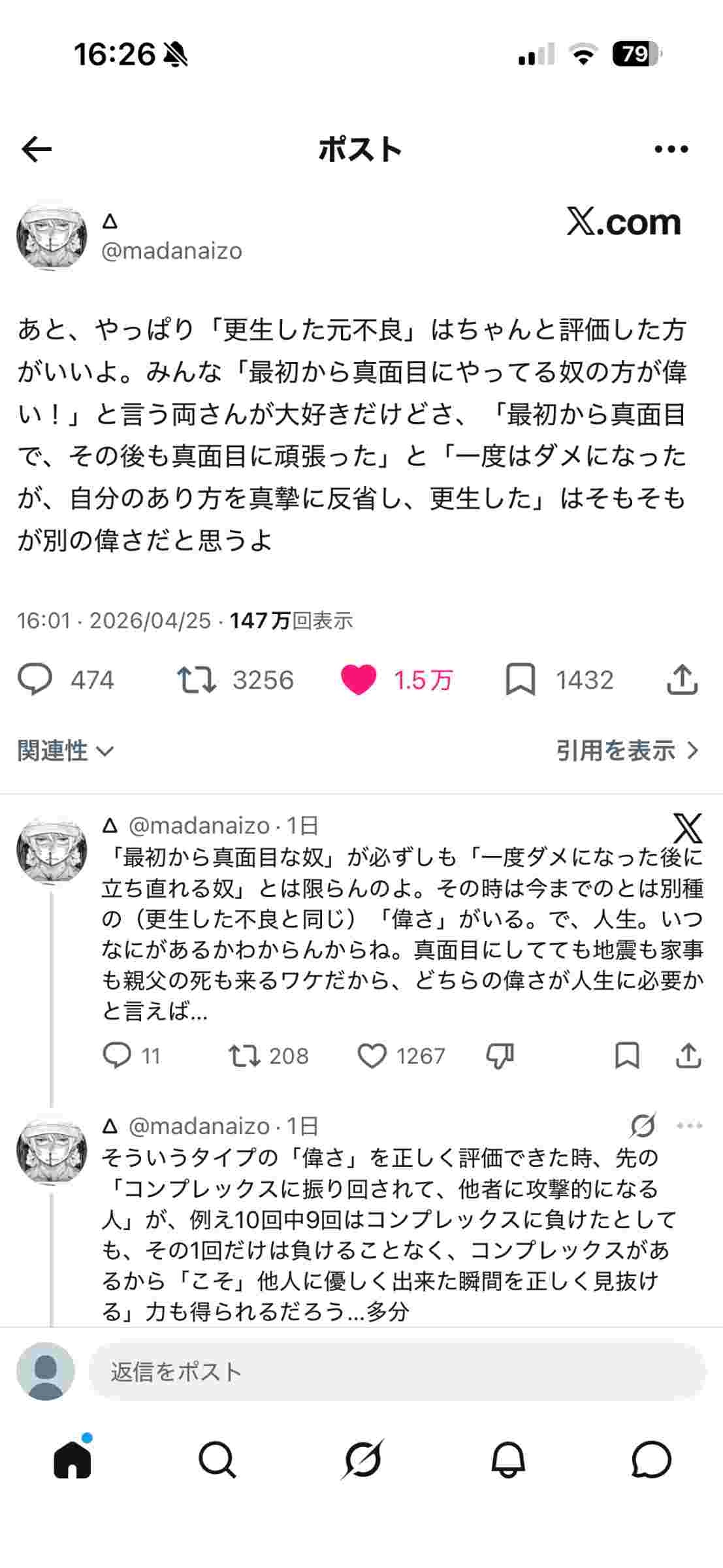 X民「『更生した不良』は一周周ってちゃんと評価してあげるべき」「逆に、何もしてないことは偉くない」1.5万いいね😲