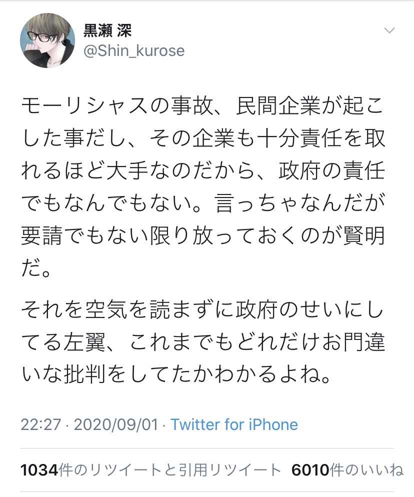 黒瀬。深「モーリシャスの事故は日本政府のせいじゃなくてただの民間企業の事故。日本に責任はない」